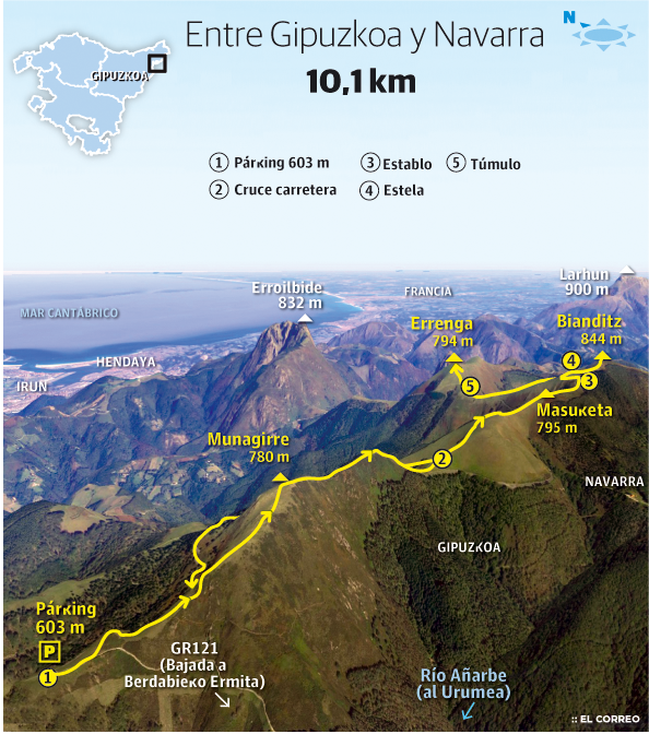 Poco después encontramos restos de un establo (1h.05’). Camino del Bianditz cabe estacar un mojón que suele pasar inadvertido. Está situado a la derecha de la senda, junto a una alambrada. En él está grabado el báculo de la Colegiata de Roncesvalles, testimonio ancestral que marcaba los límites de sus propiedades. Sin dificultades alcanzamos la cima del Bianditz. (1h.20’). Buzón con forma de tambor del Lezoko M.T. Cruz y vértice. Vistas privilegiadas sobre Navarra, Francia y la bahía de La Concha. Tras el agradable paseo, desandamos el camino hasta llegar de nuevo al establo. Continuamos por la derecha en fuerte descenso (N). Ahora seguimos las marcas de la GR 121 monte abajo (N). Pasamos sobre el túmulo de Errengako Lepoa y tras un corto repecho final, coronamos el solitario Errenga (1h.50’). Buzón de hierro del año 1964. Regresamos sobre nuestros pasos sin otra opción que volver a subir la altura perdida. Cualquier pista que parece conducir de regreso al puerto de Bianditz muere en el hayedo. De nuevo alcanzamos el establo (2h.15’). Seguimos las marcas rojas y blancas de la GR 121 que nos devuelven al parquin (3h.00’).