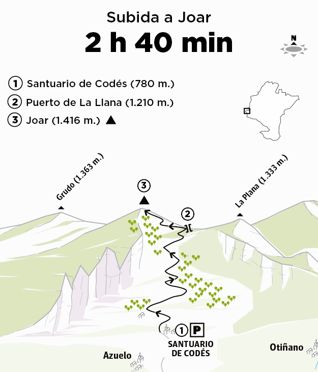 En el collado de La Llana convergen varios caminos. Joar, nuestro objetivo, está a la izquierda. Al fondo, en medio de un pinar, se esconde un refugio. Es invisible, salvo de la subida a la Plana. Un sendero bien marcado (izquierda) se dirige al techo de Codés. Sube con mediana inclinación por un hayedo (1h.05"/1270 m) hasta volver a terreno despejado. Allí enlaza con la pista de Santa Cruz de Campezo hasta el repetidor (1h.32/1.413 m). 50 metros más arriba está la cima amplia y despejada, con el vértice geodésico y los buzones (1h.35"/1.426 m).