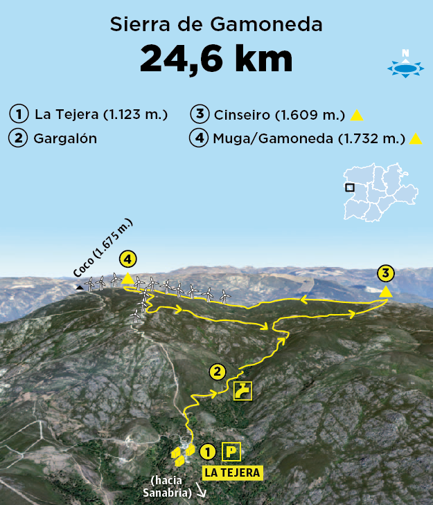 Camino de Galicia, en el límite entre Zamora y Orense, la autovía se estrecha entre dos formidables y poco visitadas cordilleras. Al NO de Sanabria, Sierra Segundera,, de morfología glaciar y en la que sobresale Peña Trevinca (2.124 m.) y el Cabril (1.859 m.) justo encima del Padornelo. Al Sur, la Sierra de Gamoneda, fronteriza con Portugal, cuyas alturas máximas son el monte Muga o Gamoneda y Los Campanarios o Cinseiro. También son graníticas y de origen glaciar. El Cabril y La Gamoneda son un buen objetivo montañero tanto por su elevación como por la dificultad de llegar a su base. En esta ocasión vamos al Gamoneda, accesible por La Tejera, una pedanía de Hermisende.