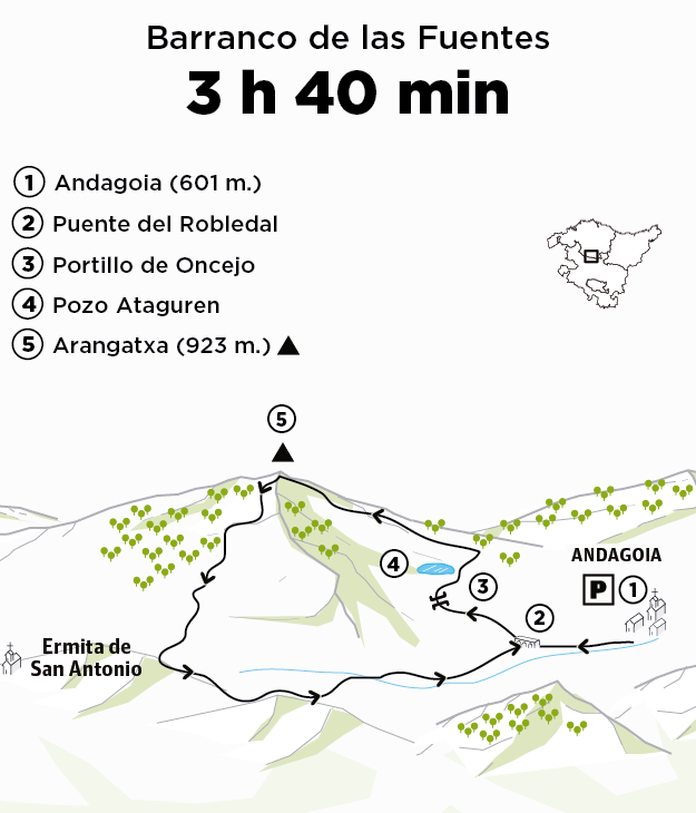 Salimos del pueblo alavés de Andagoia, enclavado en las laderas del monte Arangatxa, a 601 metros de altitud. El caserío rural, bien conservado, nos recibe mientras apreciamos la iglesia de la Asunción. Buscamos el punto más elevado del pueblo enfilando una calle que poco a poco dejará atrás las últimas casas para adentrarse en el barranco de Las Fuentes y llegar al cauce del río Yarto, que se atraviesa por el puente El Robledal. Cerca queda un pabellón de ganado. Tras atravesar una barrera, se sigue a la izquierda por una pista hasta encontrar al poco tiempo una bifurcación. Por el camino de la derecha comenzará el suave pero continuo ascenso en dirección suroeste hasta alcanzar el portillo de Oncejo (0h.45").