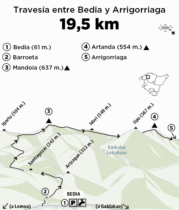 Madoz informa en su Diccionario Geográfico que Bedia está a tres leguas de Bilbao. Plaza del Ayto., con la parroquia de San Juan (a. 1742), junto a la carretera. Por detrás del frontón enlazamos con una pista paralela al río Ibaizabal. Izquierda hasta el palacio de Bidekolea, cerrado y tapiado (0h.07"). Puente. Cruzamos al otro lado. La pista pasa sobre la vía del tren y alcanza (dch.) el barrio de Barroeta y continúa.Cruce de caminos (0h.15"). El ramal de la izquierda, grava y cemento, sube entre pinos con fuerte pendiente. Lo seguimos. Paso canadiense. Más arriba hay otro cruce (0h.23"). Por la izquierda se desvía al caserío Aldai. Vamos de frente entre el arbolado. La pista surca la ladera del barranco que en los viejos mapas catastrales se denominaba "Ucharain".Encrucijada de la que parten tres sendas (0h.30"). Desechamos la que baja. Cualquiera de las otras conduce a un amplio claro en el pinar bajo la cima de Santiagozar, invisible desde esta posición.La pista se embarra. En una curva baja un arroyo de escaso caudal. Antes del paso de los camiones madereros hubo una fuente. Terreno abierto (0h.45"). Apario aparece arriba, a la izquierda. Perdemos metros hasta una curva. También había fuente, ahora seca (0h.50"). De igual manera se han derrumbado los dos caseríos que se escondían en la hondonada. Las zarzas ocultan los muros.La pista bordea la cima de Artzagain (dch.), donde vemos unas grandes encinas entre pinos. Collado (1h.05") desde donde se atacaba el Apario. Un haya solitaria sobresale sobre el pinar apretado y oscuro. El camino ha desaparecido. La espesura es impenetrable.Vamos de frente entre pinos altos y espaciados. Se oye el fragor de la cantera. El cemento aparece en una bifurcación. Desechamos el ramal del Apario. La pista (dch.) es ahora de grava. Pierde altura, llanea y llega a un refugio con zona abierta y fuente (1h.25").El camino sube. Al rato, ya en la repoblación de hayas que ocupa la hondonada de Kortabaso, vemos una barrera a la izquierda (1h.45"). Una vez al otro lado, una pista nos acerca a la alambrada que protege los árboles (1h.52"). Paralelo al alambre (izq.) sube un estrecho sendero, pendiente y bien pisado. Lleva a un pinar cerrado (marcas) que enlaza con la pista que viene de Arginatxa (1h.58"). Señal de coto de caza. Marchamos (derecha) por un camino encharcado que lleva al Mandoia, que se alcanza tras un repecho exigente.